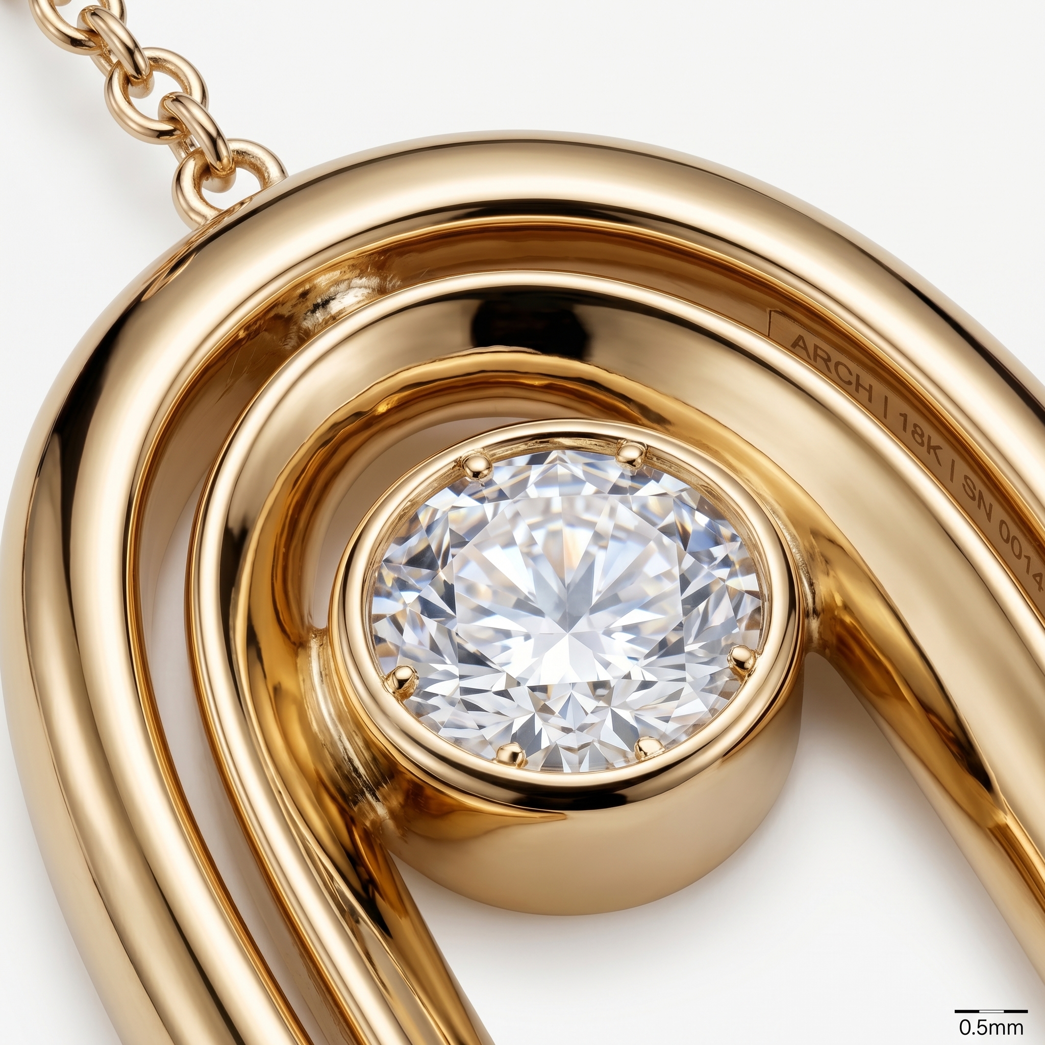 靈感源自羅馬競技場拱門結構的抽象雕塑形式。拋光香檳金色14K鍍金弧線形成完美半橢圓穹頂造型,拱頂中央鑲嵌切割白鋯石作為視覺焦點。