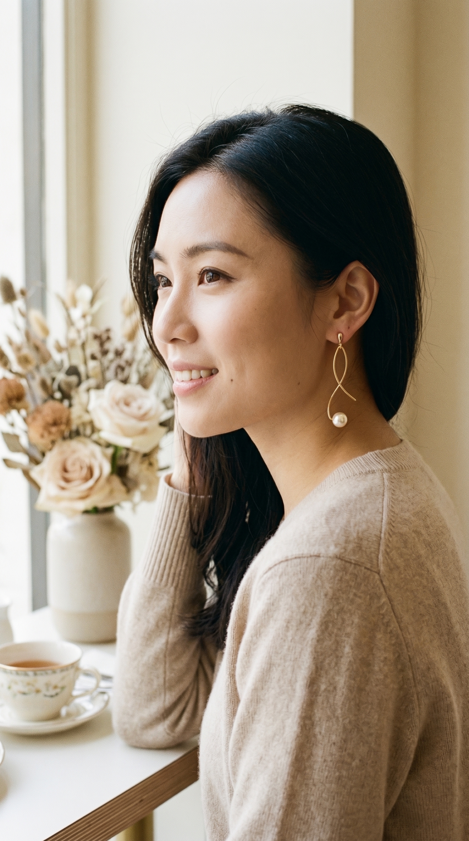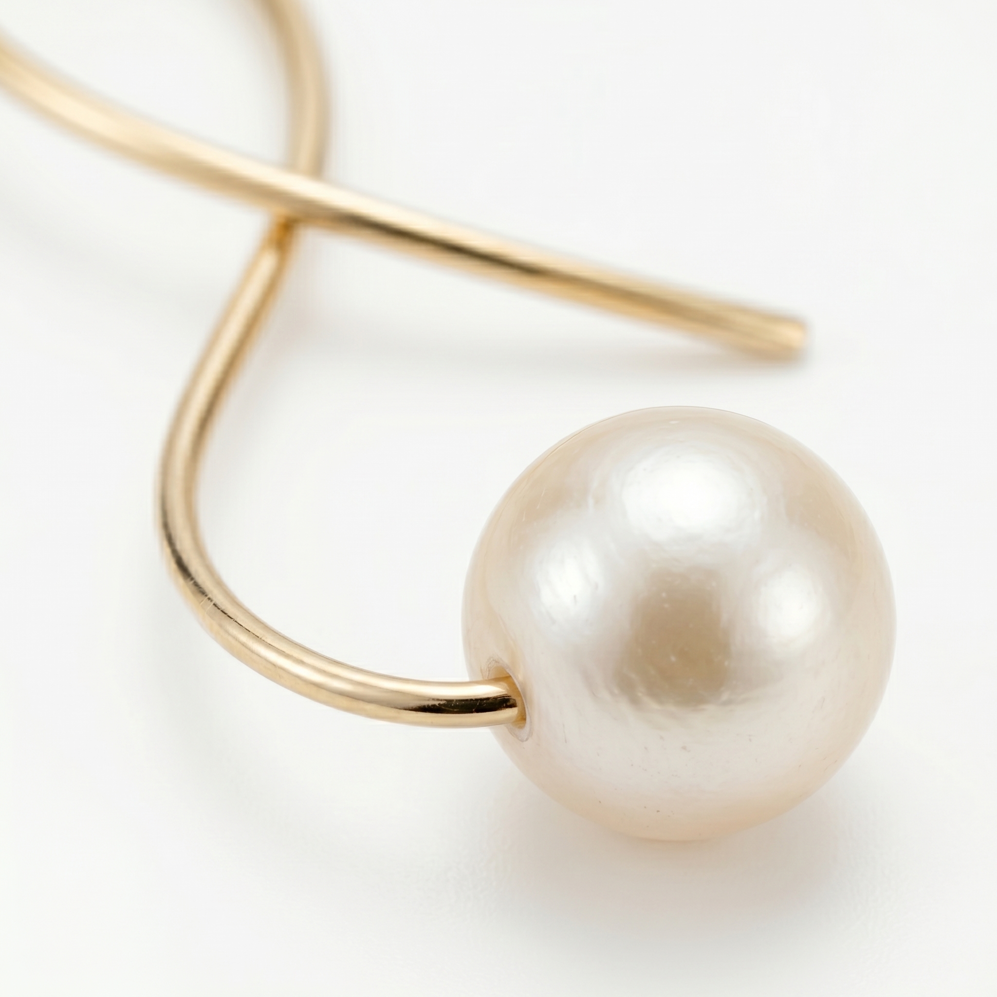 超細鍍金銀絲從耳針垂落呈現風吹般的優雅弧度,末端點綴3mm淡水珍珠散發柔和光澤。